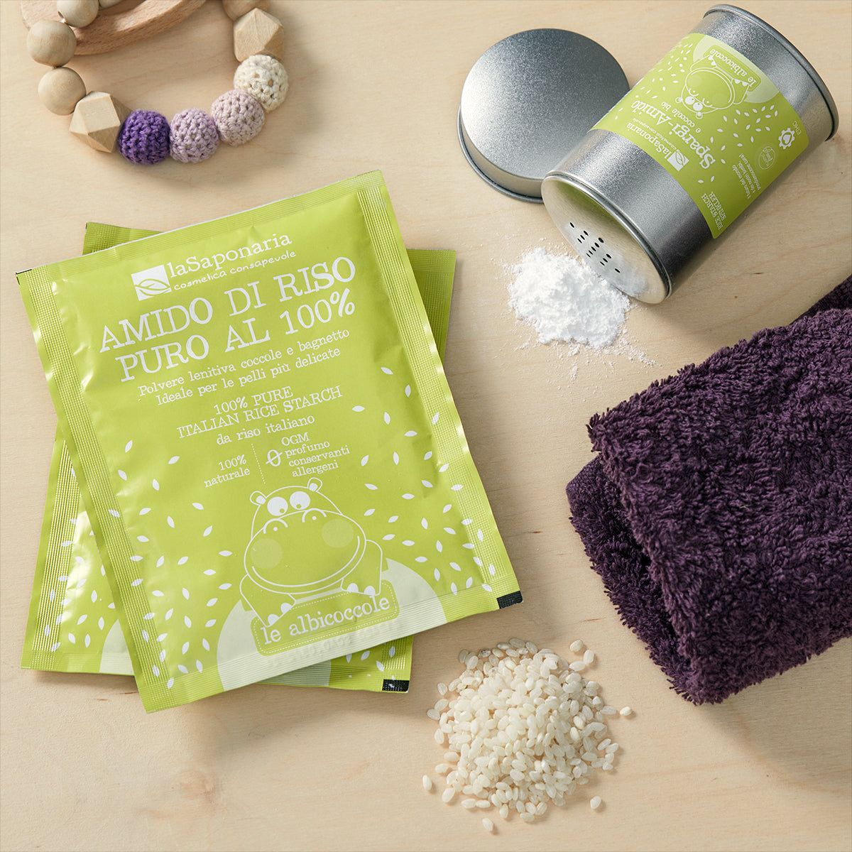 L’Amido di riso è una polvere lenitiva ideale per le pelli più delicate. Per questo si presta ad essere usata nel bagnetto di bimbi piccoli e piccolissimi, per tante coccole delicate. Il nostro amido è puro al 100% e proviene da riso italiano, senza OGM, profumo, conservanti e allergeni.
