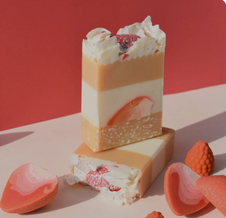 Realizzato in piccoli lotti con sette burri e oli biologici – tra cui Karité, Cacao, Cocco, Avocado, Ricino e Mandorla Dolce – deterge dolcemente, lasciando la pelle idratata, luminosa e profumata con un tocco irresistibile di fragole fresche e bollicine.