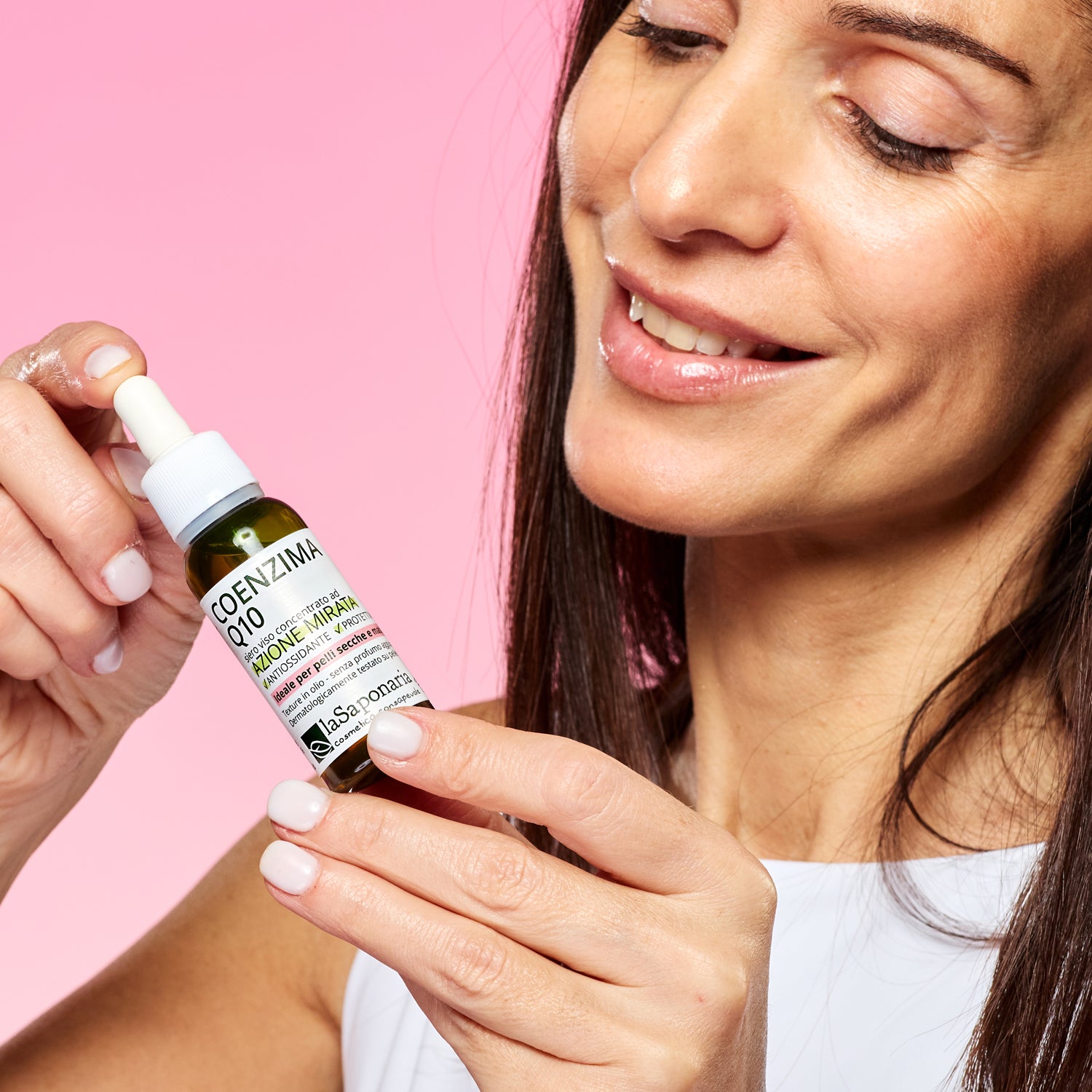 - Extra tip: la sua ricca texture in olio rende il Coenzima Q10 ideale per eseguire un massaggio a viso e collo. Facendo una leggera pressione con le dita esegui movimenti che vanno dal basso verso l’alto e dal centro del viso verso l’esterno.
