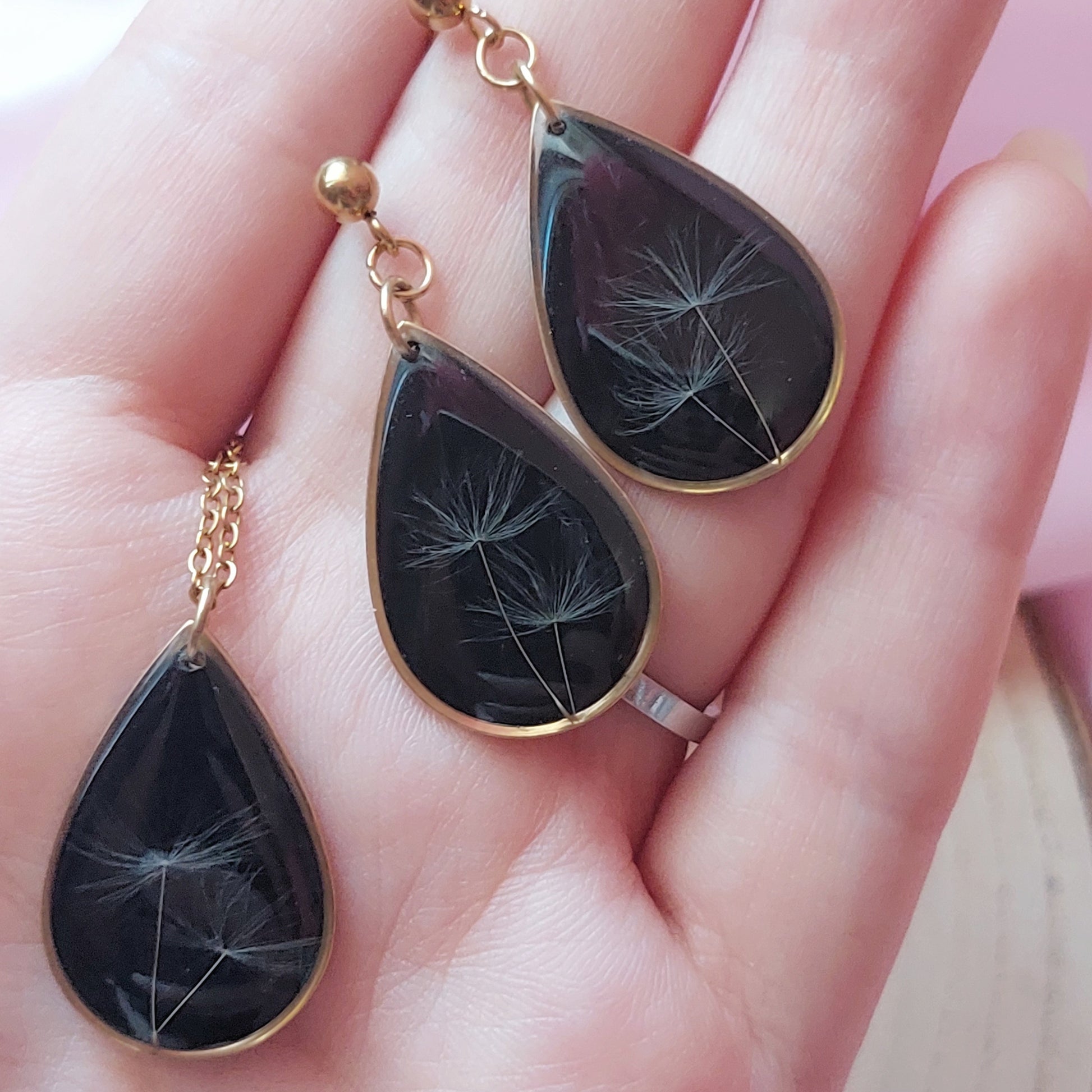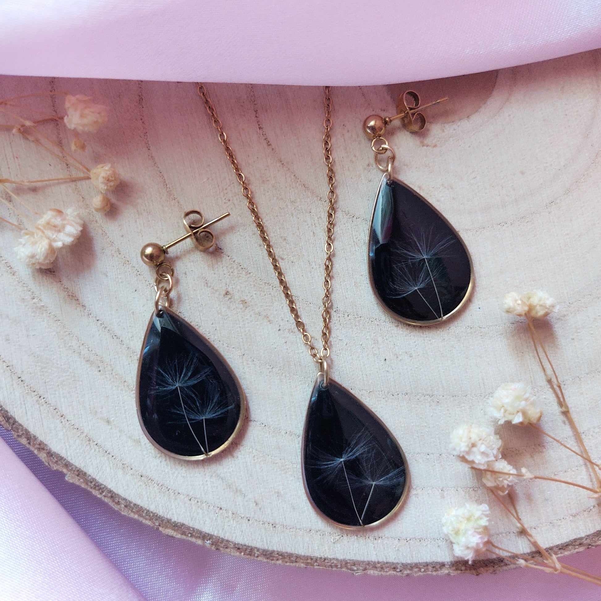 Questi gioielli a forma di goccia in acciaio inossidabile dorato custodiscono un piccolo incanto: veri fiori di tarassaco (soffione), adagiati su uno sfondo nero profondo come il cielo notturno.