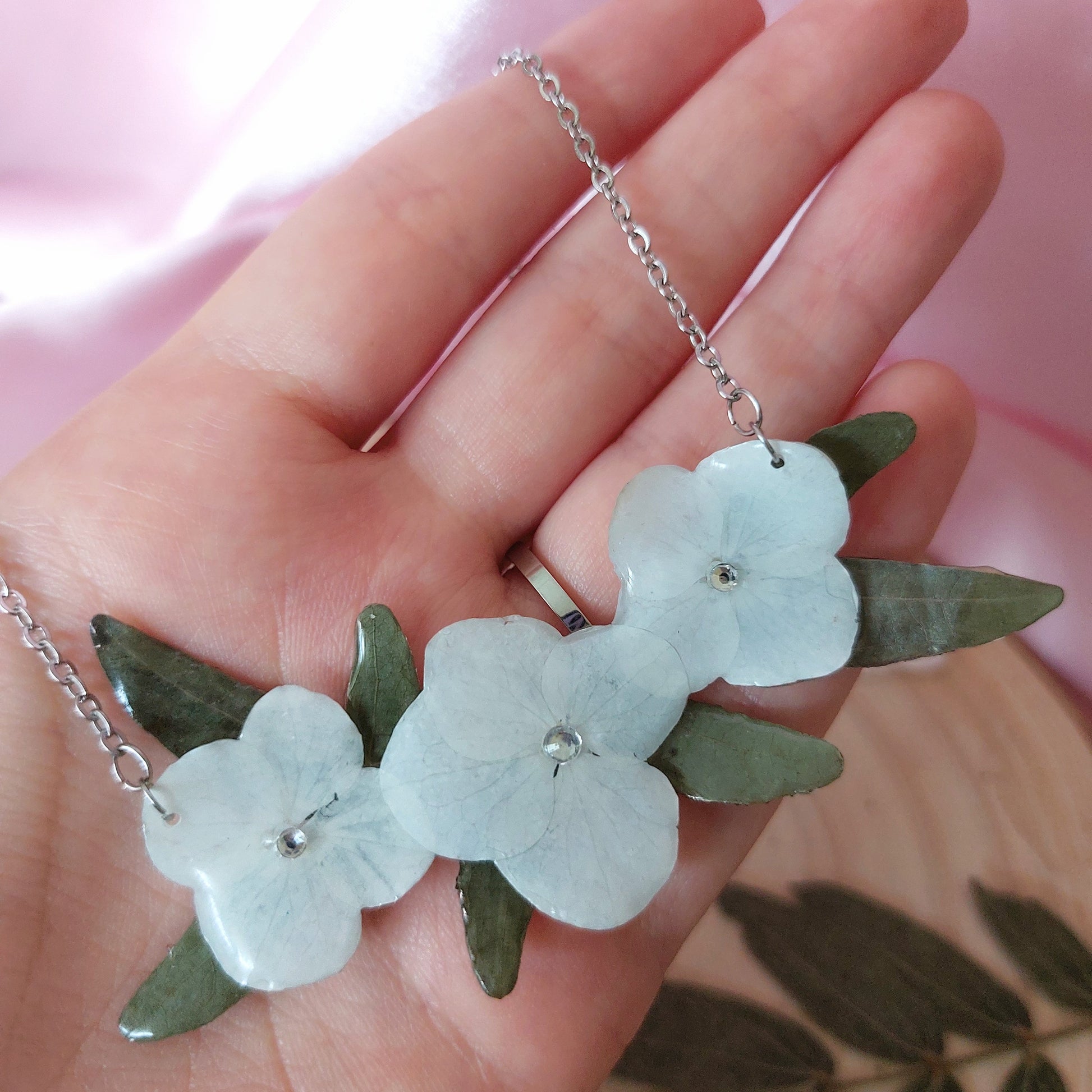 ✨ La collana è un elegante girocollo in acciaio inossidabile, con tre ortensie disposte in orizzontale, intrecciate a foglie di calliandra in una composizione armoniosa, quasi floreale.
