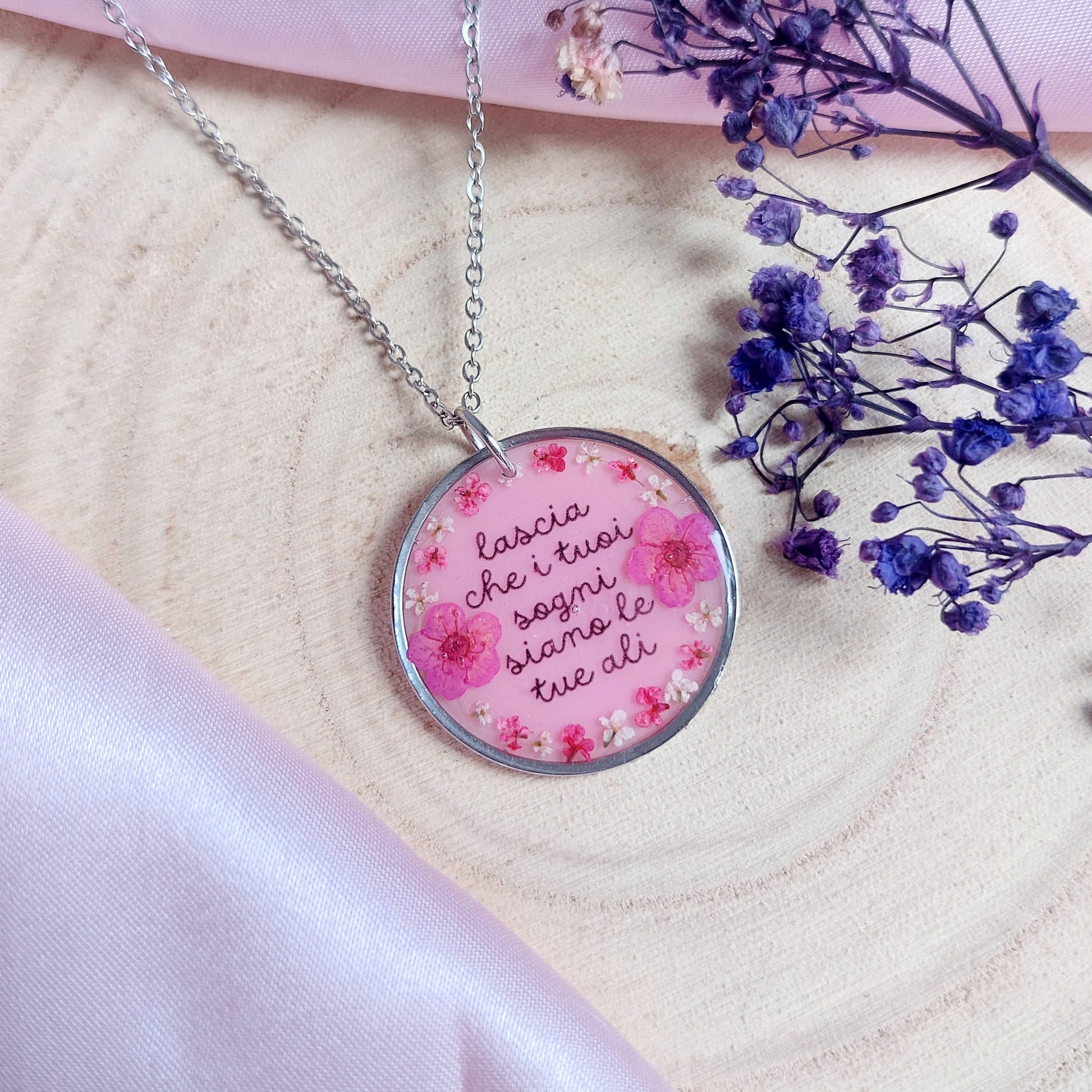 Il ciondolo rotondo racchiude uno sfondo rosa delicato, su cui spicca la frase ispirazionale “Lascia che i tuoi sogni siano le tue ali”, incorniciata da veri fiorellini essiccati di carota selvatica e spirea rosa e bianchi, custoditi con cura in resina trasparente.