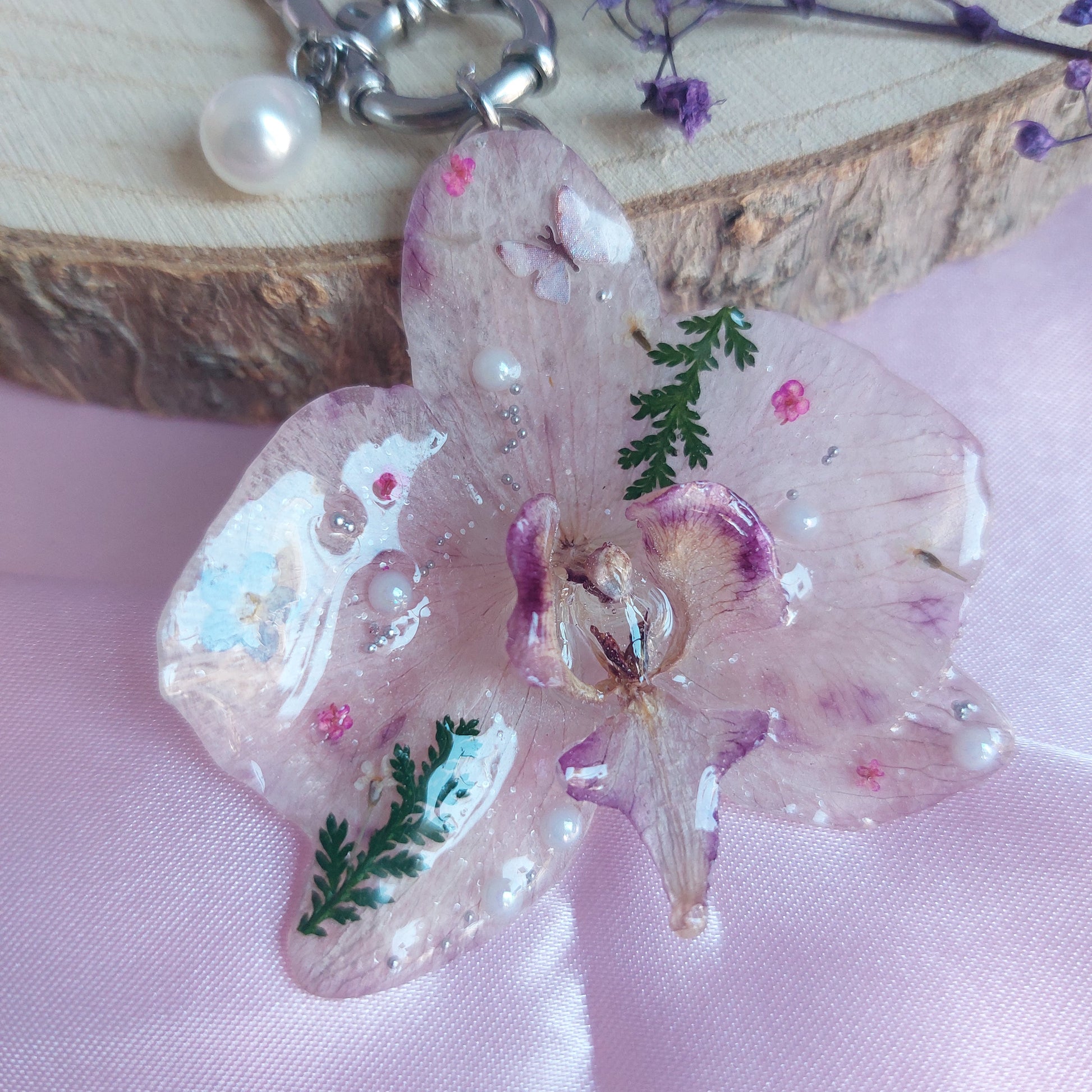 Un gioiello che racchiude l’eleganza e la delicatezza della natura. Questa collana unica presenta un’orchidea vera, essiccata e resinata in purezza per preservarne la forma e la struttura originale. Sulla corolla, minuscoli fiori e foglioline si intrecciano con una graziosa farfallina, brillantini argentati e piccole perle bianche, creando un piccolo mondo poetico sospeso.