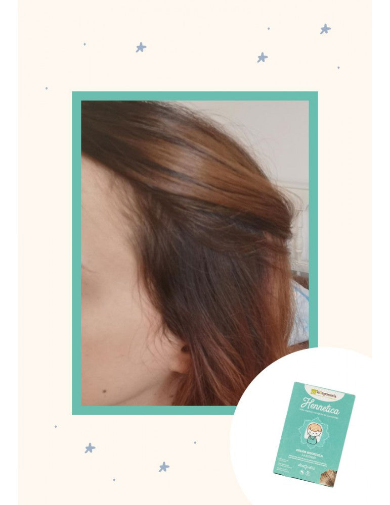 Tinta vegetale e vegana per capelli color nocciola con riflessi caldi.