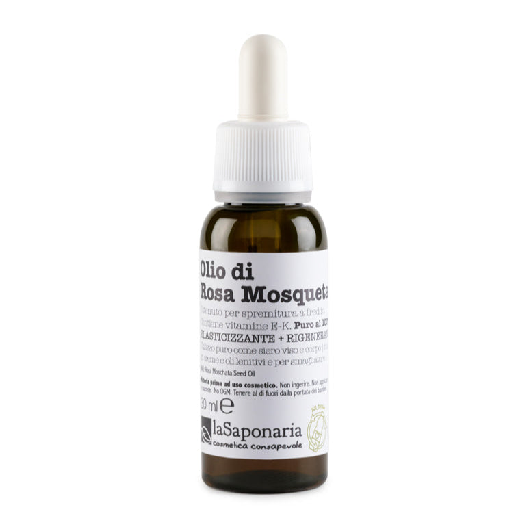 L’olio di rosa mosqueta è un preziosissimo alleato della nostra bellezza. È ricco di acidi grassi polinsaturi, come l'acido linoleico (ricostituente cutaneo), vitamina E (antiossidante) e K (utile per combattere couperose ed invecchiamento cutaneo), squalene (emolliente ed antiossidante) e vitamina A (stimola il rinnovamento cellulare).