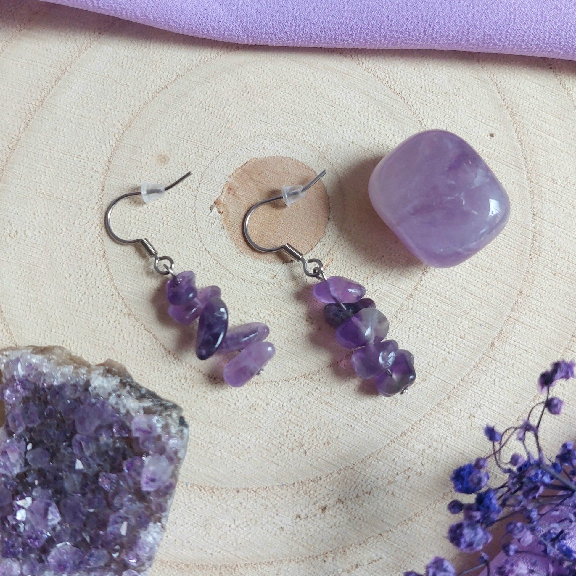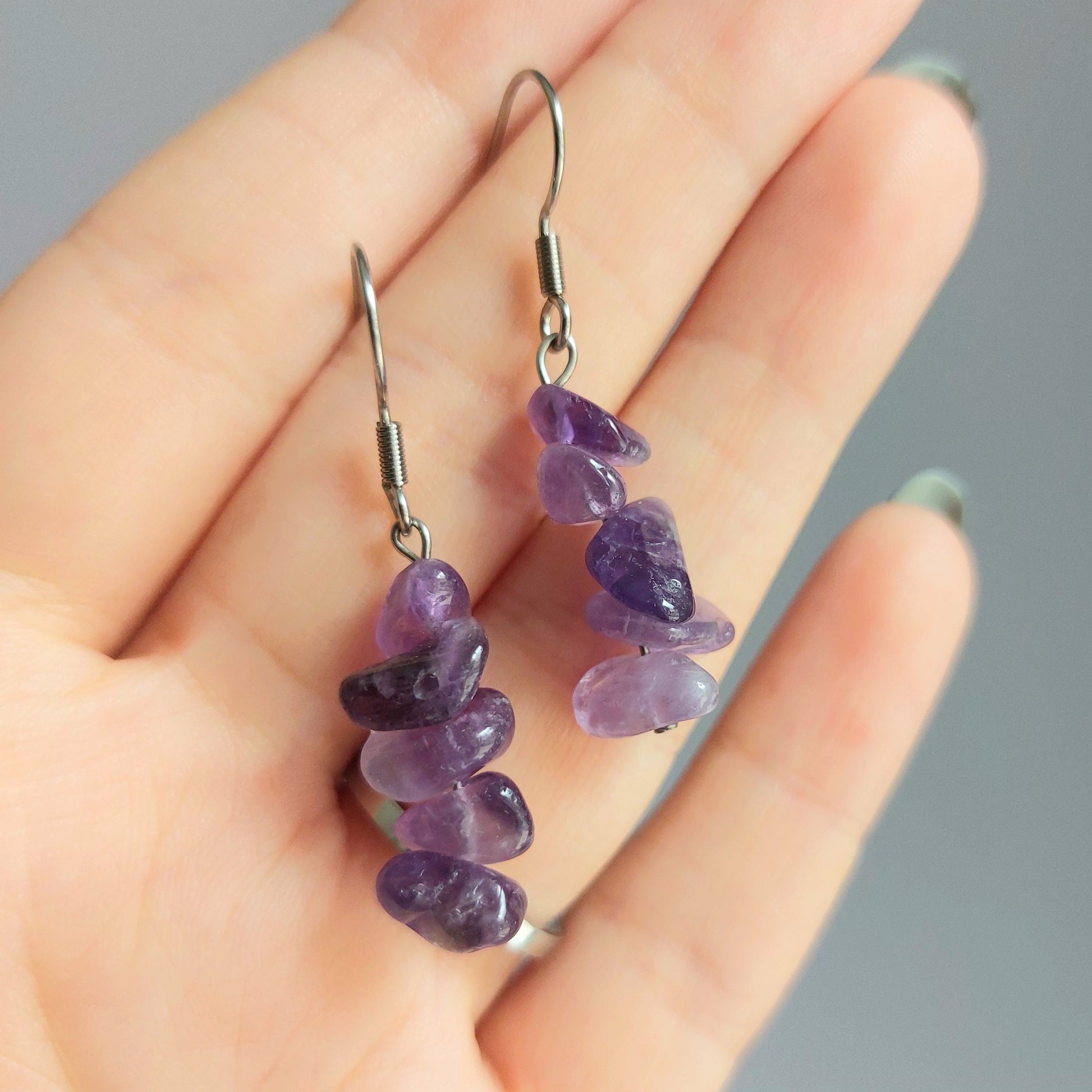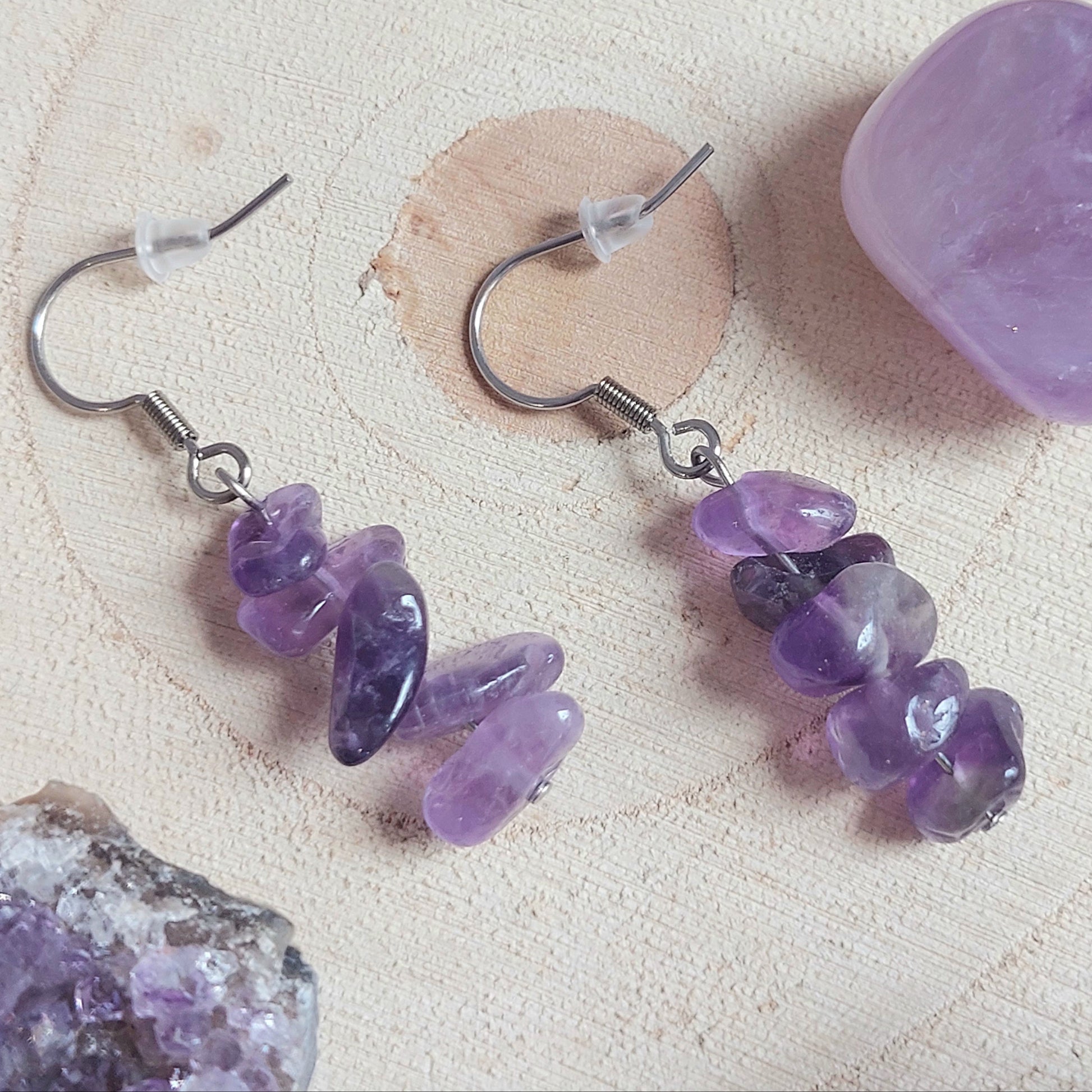 Eleganti e delicati, questi orecchini sono realizzati con chips naturali di ametista, montati su monachelle in acciaio inossidabile color argento.