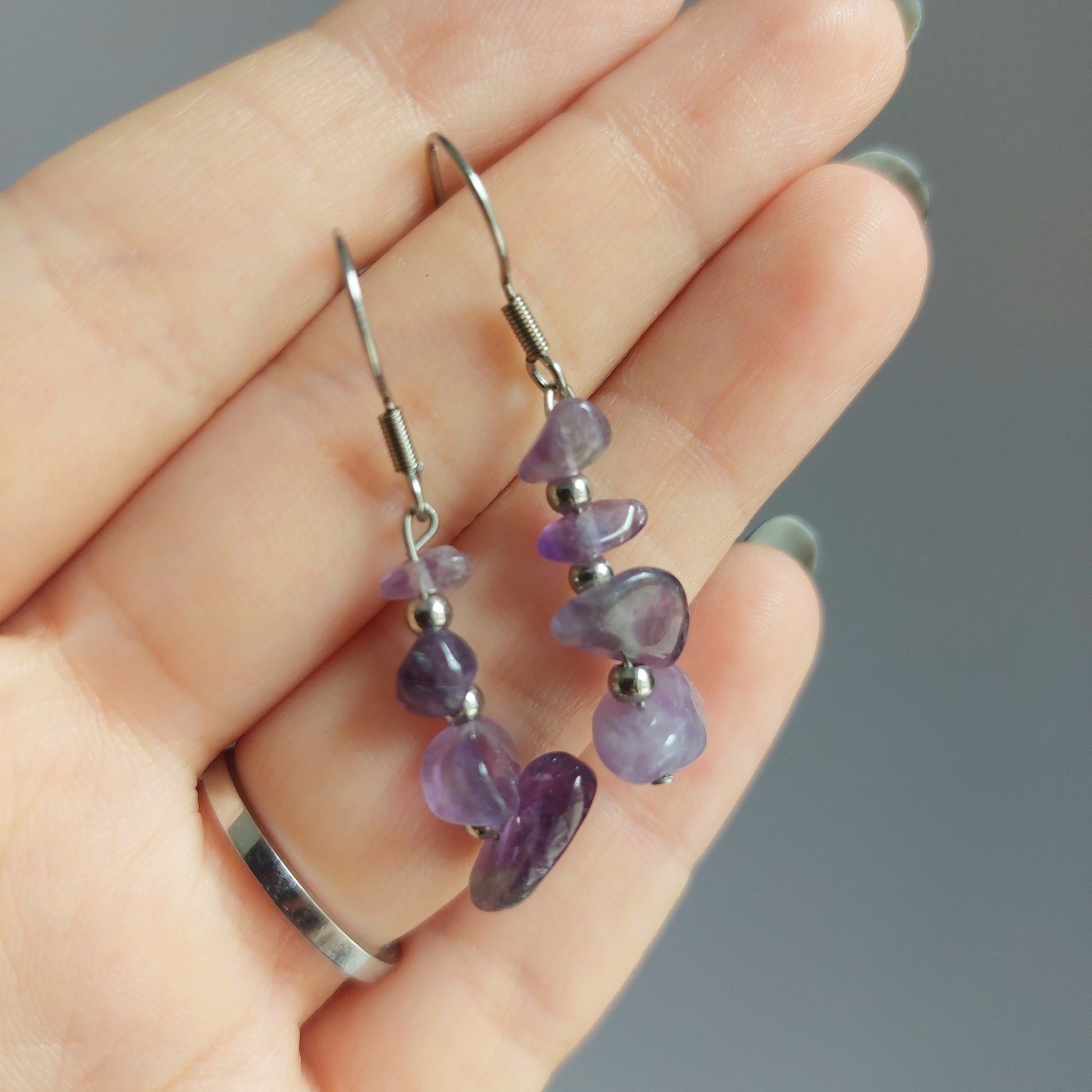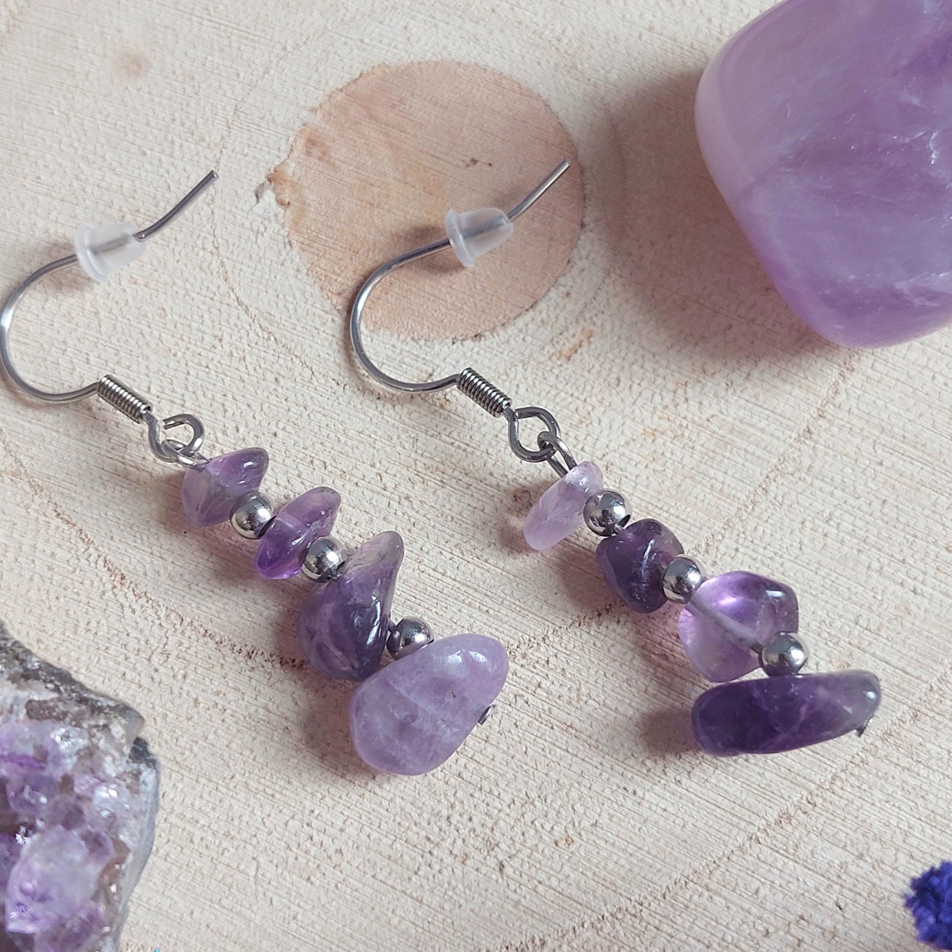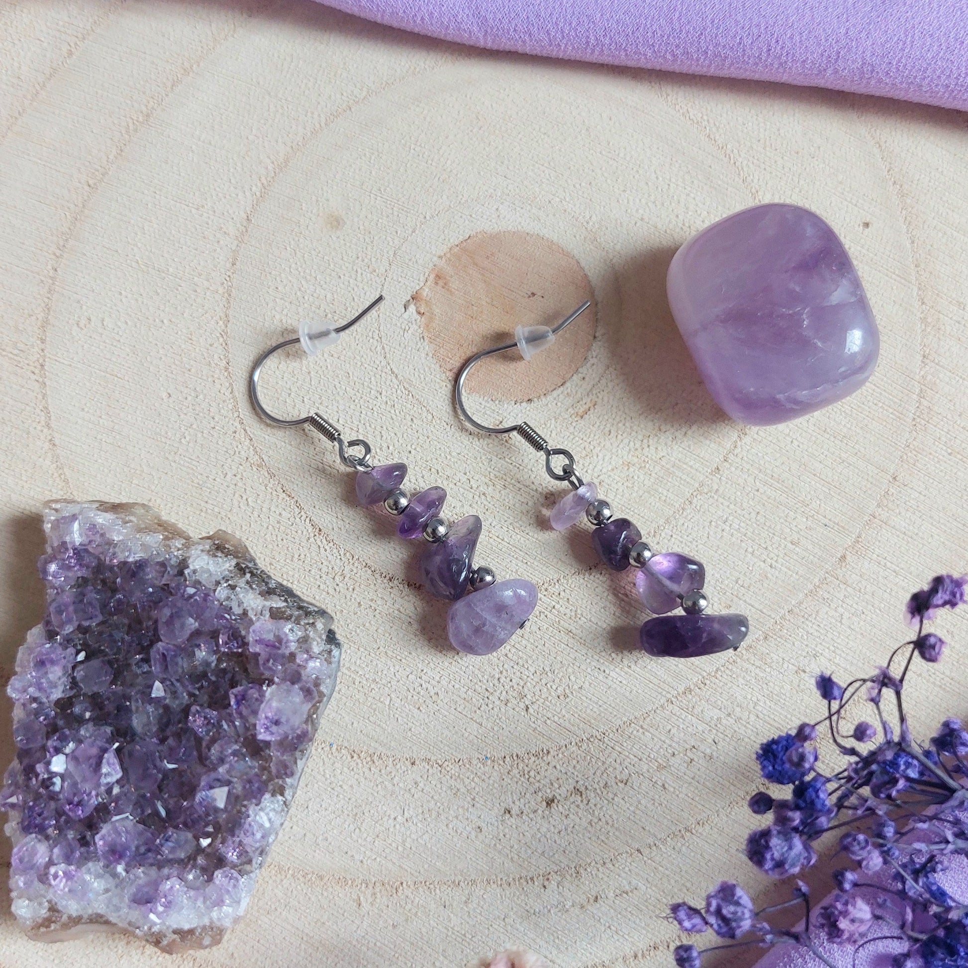 Eleganti e delicati, questi orecchini sono realizzati con chips naturali di ametista e perline in acciaio, montati su monachelle in acciaio inossidabile color argento.