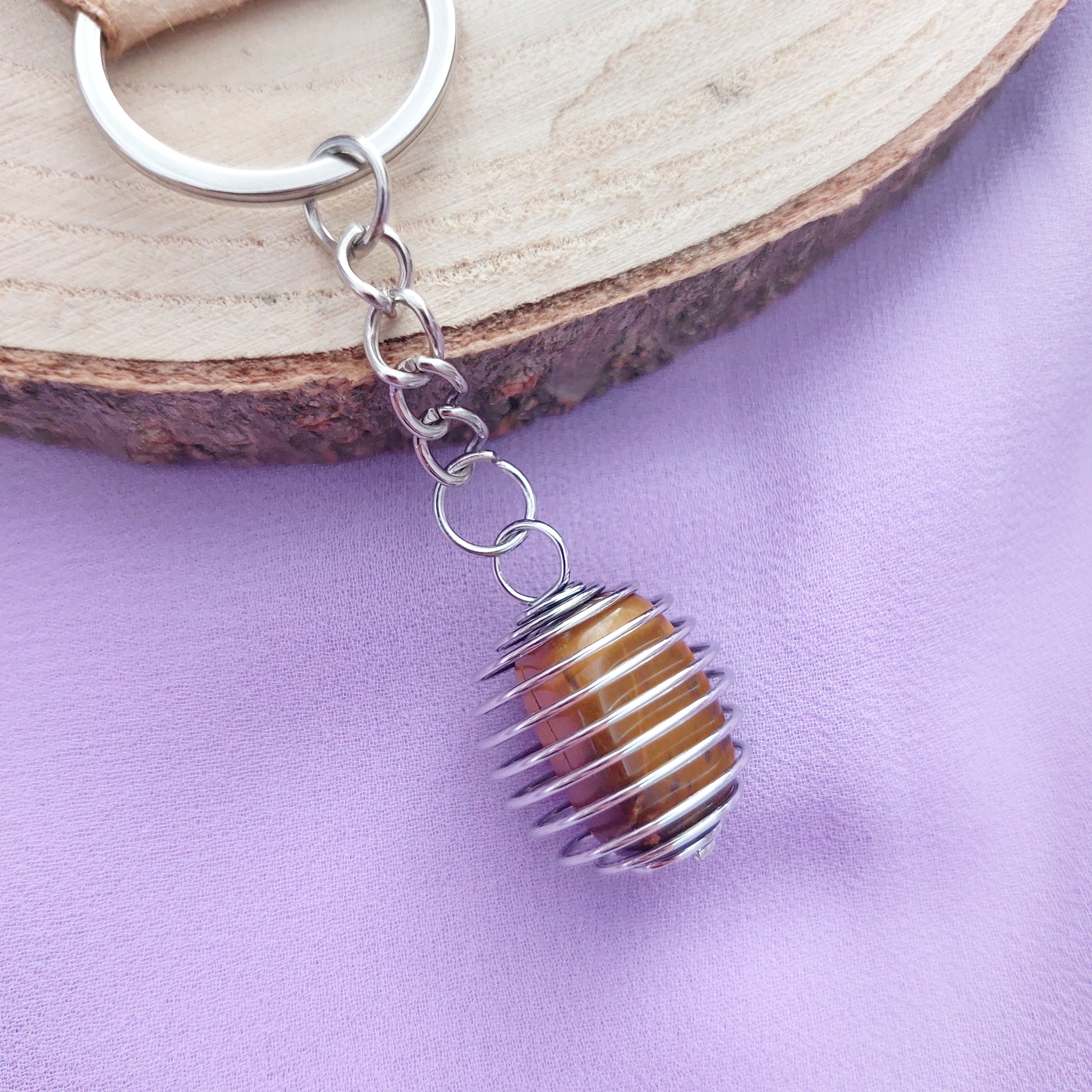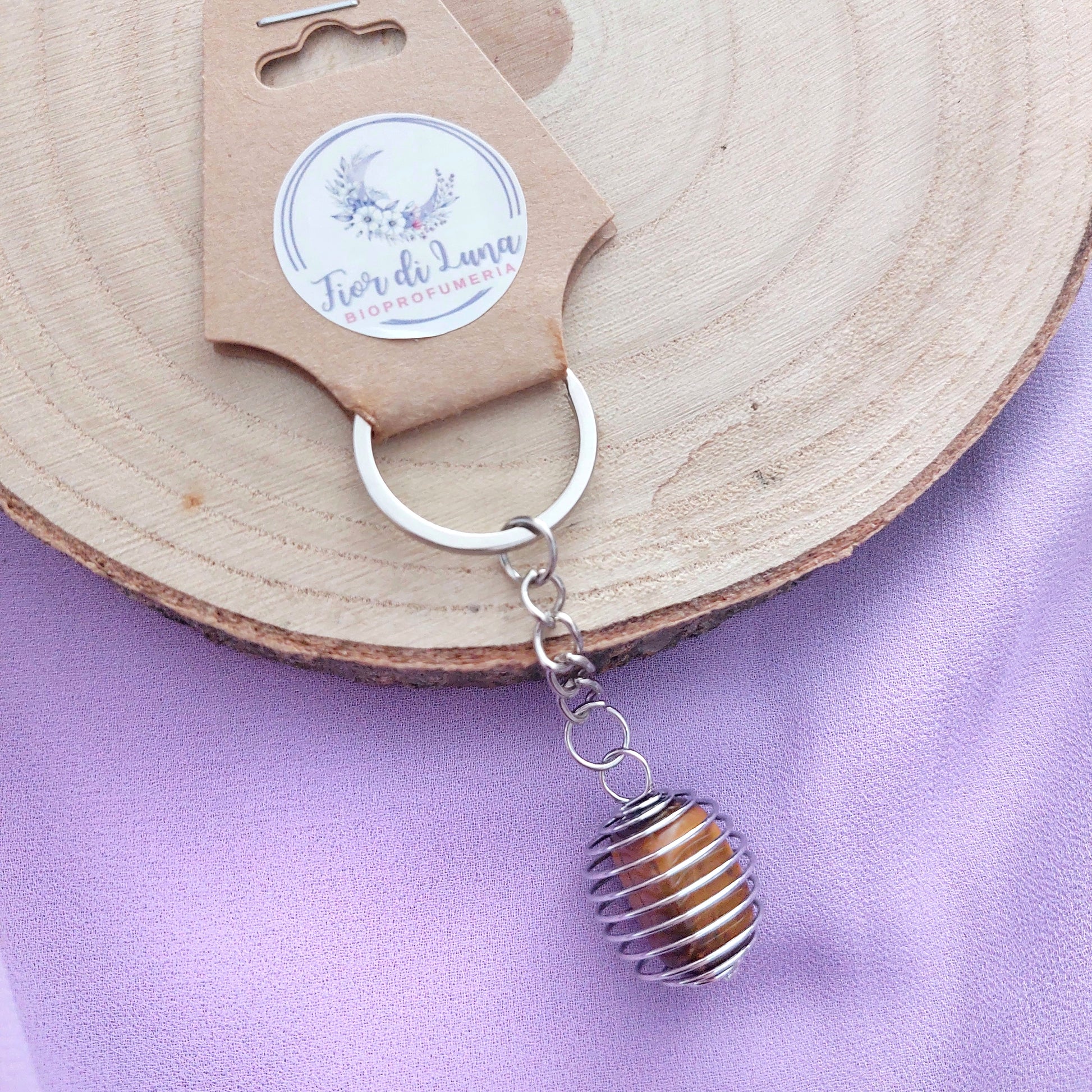 Portachiavi con pietra naturale di Occhio di Tigre racchiusa in una gabbietta in acciaio inossidabile.