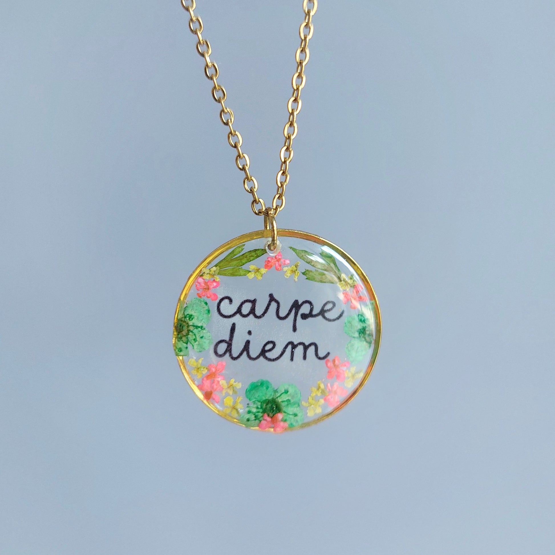 Collana con ciondolo rotondo in resina trasparente che racchiude un vivace mix di fiori gialli, arancio e verdi, con al centro la scritta “Carpe Diem”. La catenina è in acciaio inossidabile dorato, luminosa e resistente.